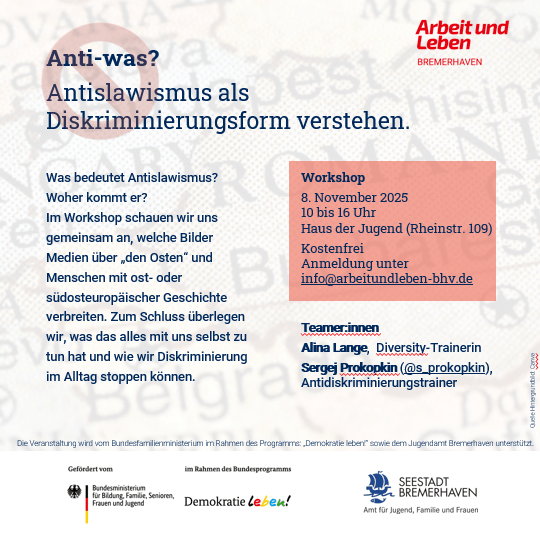 Haus der Jugend, Rheinstr. 109 27570 Bremerhaven Rheinstraße, Stadtjugendring Bremerhaven e.V., 27570 BremerhavenMenschen mit osteuropäischen Wurzelngehören längst zu Deutschland – nicht erstseit dem Krieg in der Ukraine. Trotzdemhalten sich viele Vorurteile hartnäckig.Schon