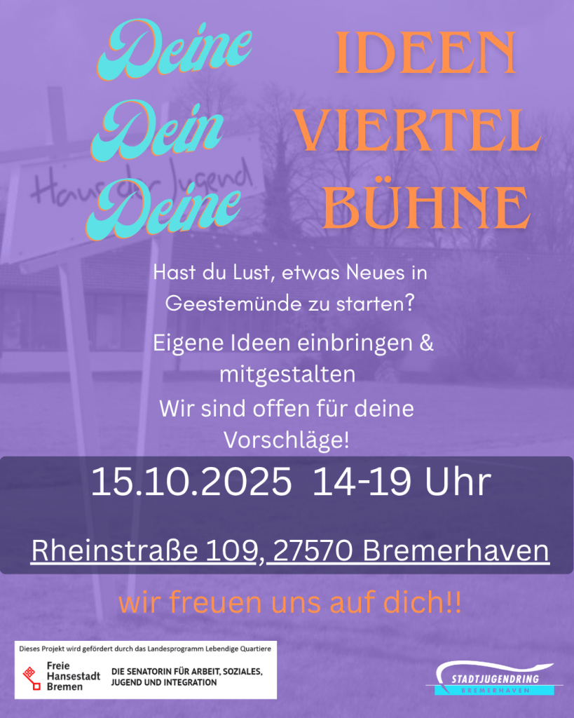 « Alle Veranstaltungen Deine Ideen, dein Viertel, deine Bühne Oktober 15 @ 14:00 – 19:00 Zum Kalender hinzufügen Google Kalender iCalendar Outlook 365 Outlook Live