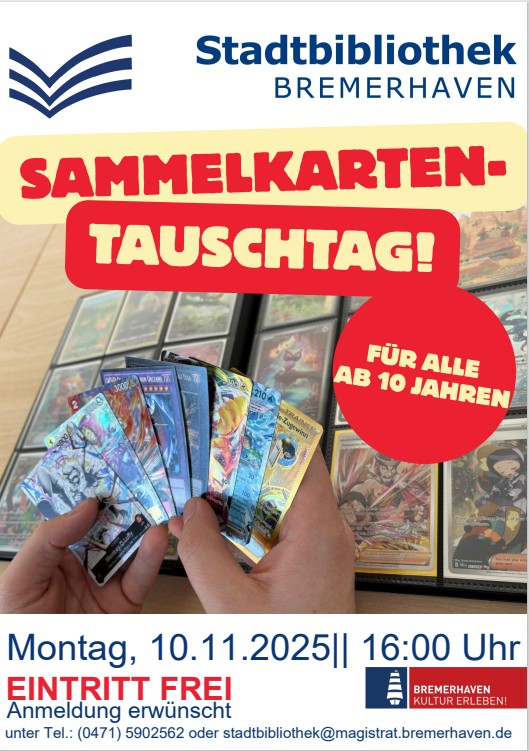 Tauschspaß, Spiel und Begegnung! Hier dreht sich alles um das Tauschen, Sammeln und Entdecken deiner liebsten Sammelkarten wie Pokémon, Yu-Gi-Oh!, Fußballkarten und viele mehr. Der Sammelkartentauschtag bietet euch, doppelte Karten zu tauschen, eure Sammlungen zu vervollständigen oder vielleicht sogar eure Chase-Cards zu finden und nebenbei sogar neue Leute kennenzulernen. Komm vorbei und tausch dich glücklich!