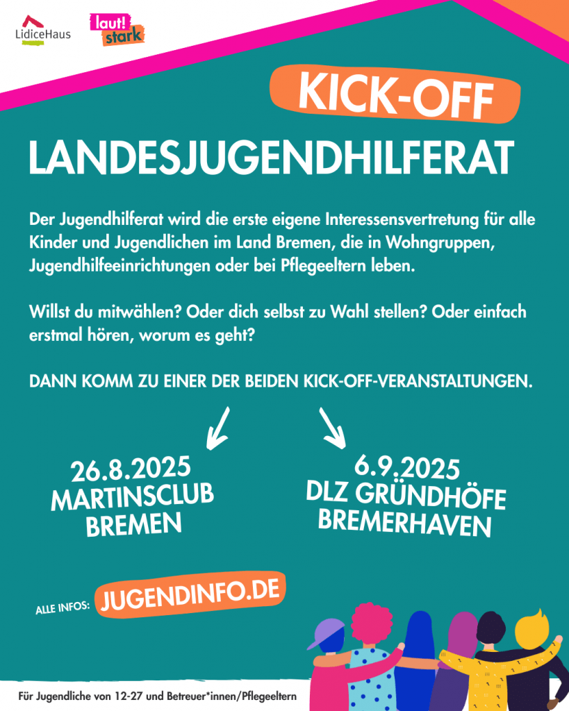 Du lebst in einer Wohngruppe, einer ähnlichen Einrichtung oder bei Pflegeeltern in Bremen oder Bremerhaven? Du hast Lust mitzureden und dich für deine Interessen und die der anderen stark zu machen? Dann komm zu einer unserer Kick-Off-Veranstaltungen zum Landesjugendhilferat.